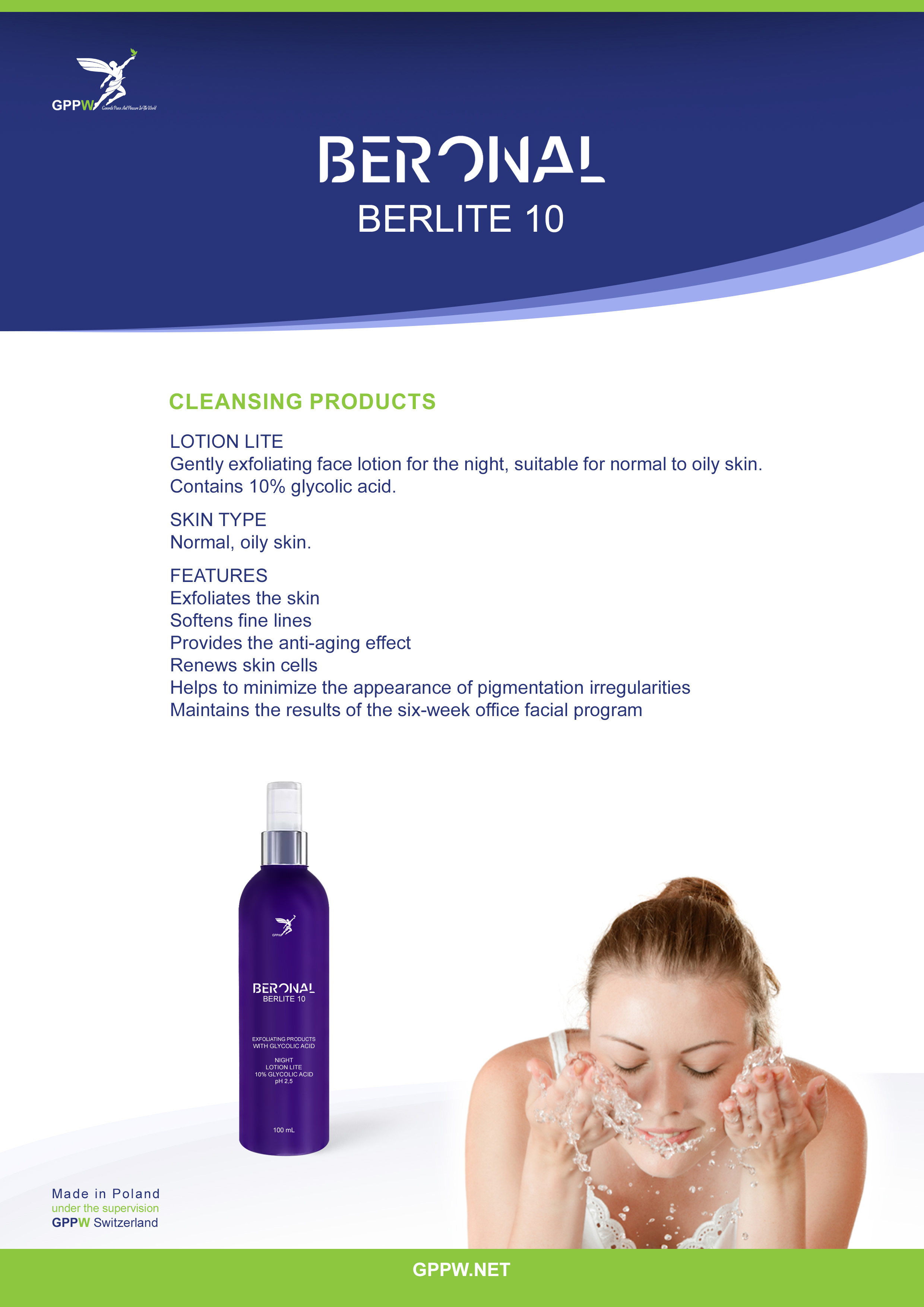 Gently exfoliating face lotion for the night, suitable for normal to oily skin. Contains 10% glycolic acid.