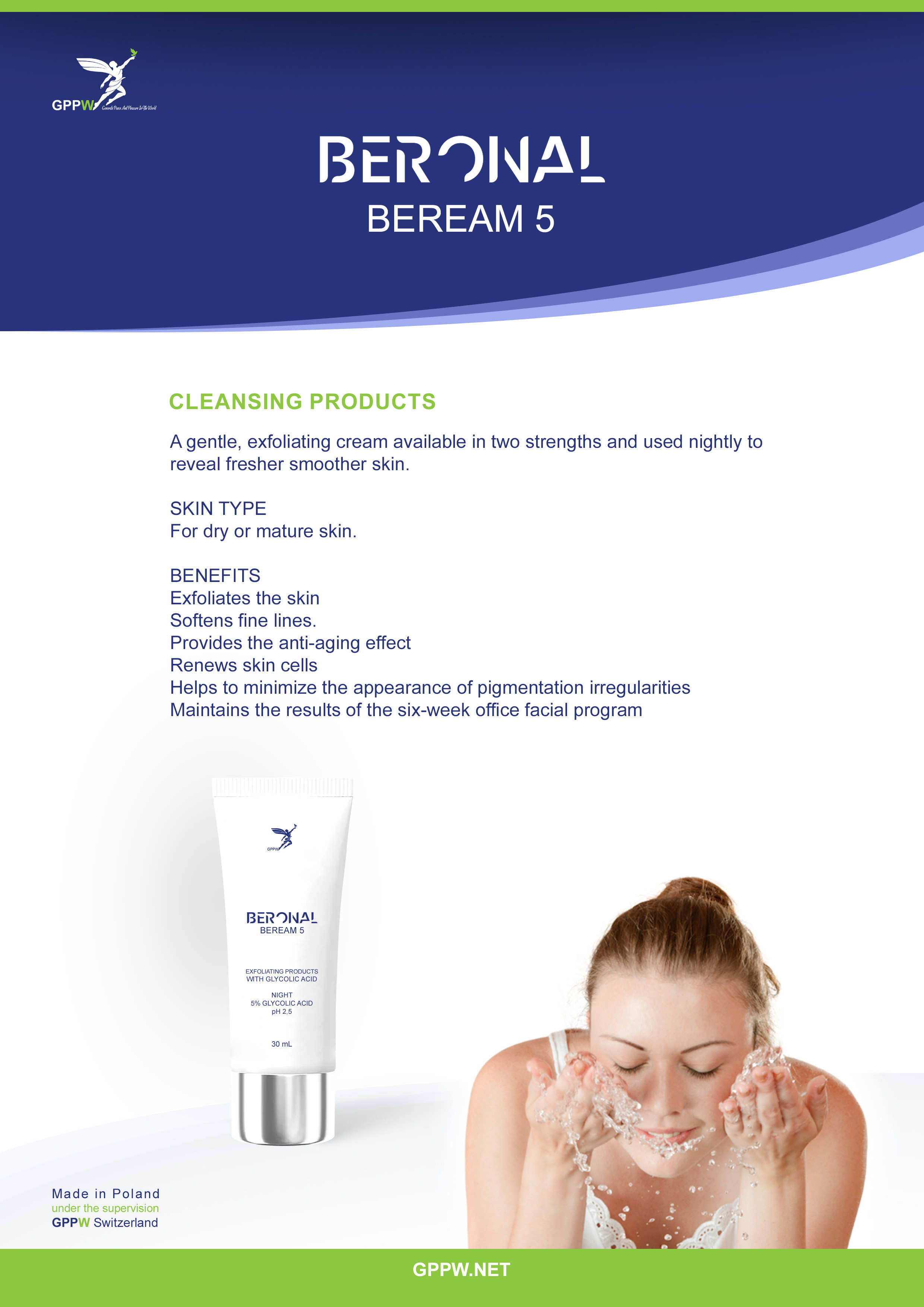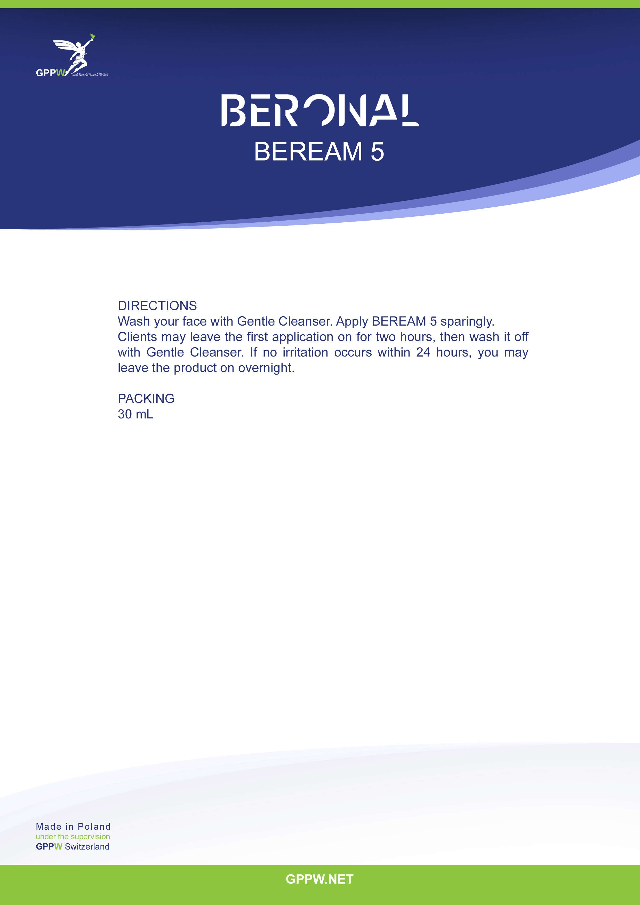 Wash your face with Gentle Cleanser. Apply BEREAM 5 sparingly. Clients may leave the first application on for two hours, then wash it off with Gentle Cleanser. If no irritation occurs within 24 hours, you may leave the product on overnight.